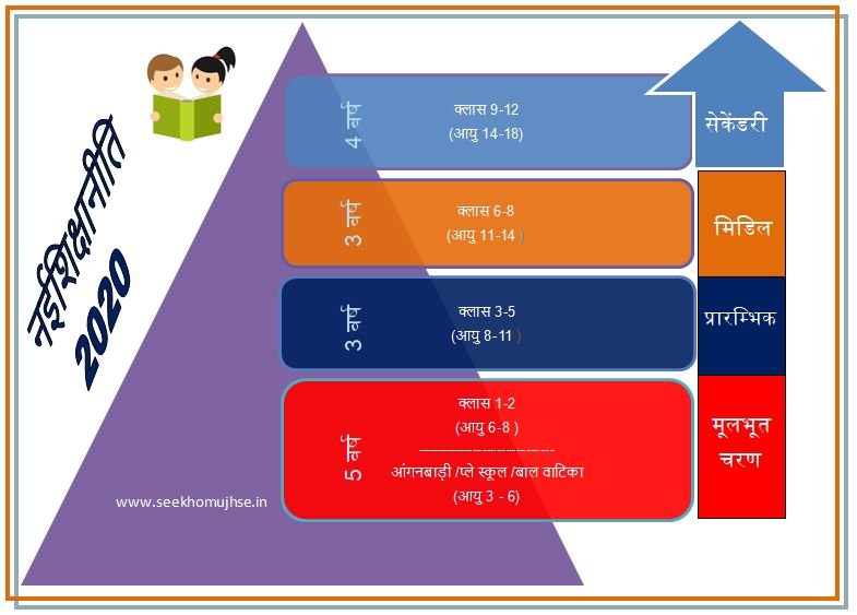 - नई प्रणाली में प्री स्कूलिंग के साथ 12 साल की स्कूली शिक्षा और तीन साल की आंगनवाड़ी होगीअब स्कूल में पहले 5 वर्ष प्री-प्राइमरी तथा पहली और दूसरी कक्षा के लिए होगा।